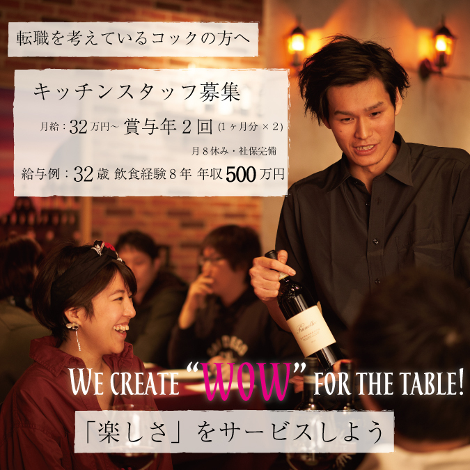 "더 요리를 다하고 싶다" "장래 자신의 가게를 갖고 싶다" "즐겁게 일하면서 성장하고 싶다" 그런 당신에게 딱 맞는 직장입니다!